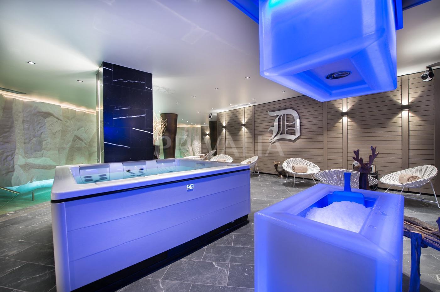 The wellness level is a true sanctuary of relaxation, featuring an impressive indoor spa with swimming pool, jacuzzi, sauna, steam room, massage room, and fitness area. The property also includes a private cinema, a wine cellar, a ski room, and a car lift leading to both indoor and outdoor parking areas.