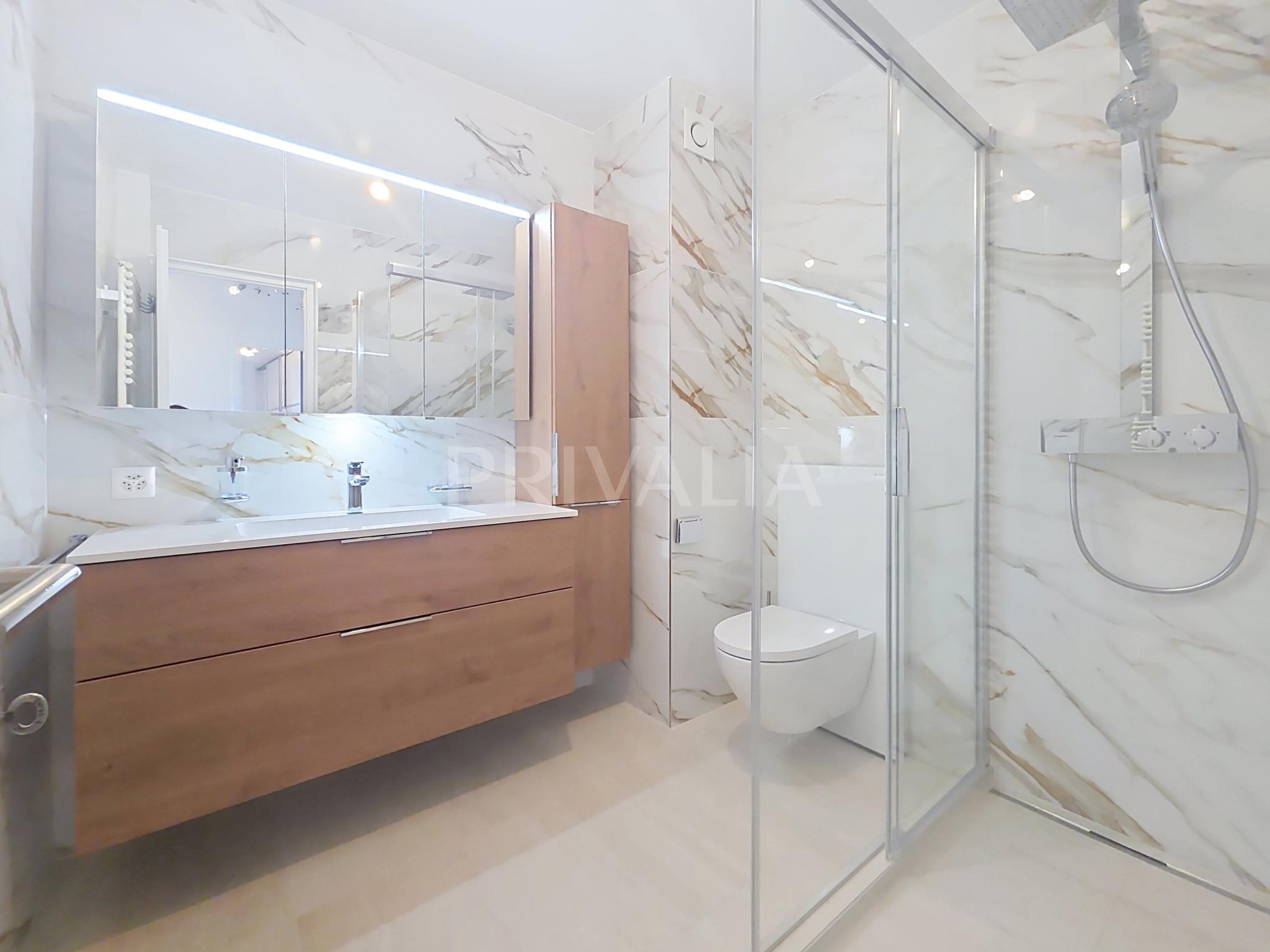 Récemment rafraichit, cet appartement orienté plein sud profite d'une distribution agréable et fonctionnelle et offre des prestations de qualité telle qu'une cuisine fermée neuve entièrement équipée et agencée, salles d'eau modernes, stores électriques ou encore deux balcons d'une surface totale de 12 m2.