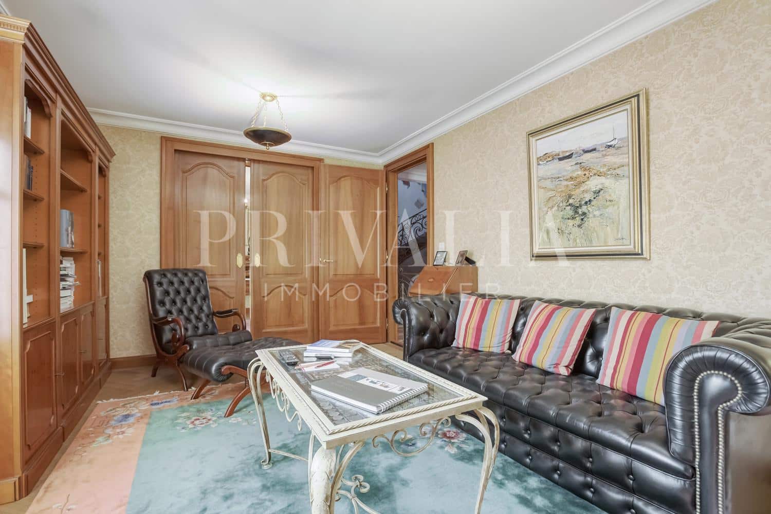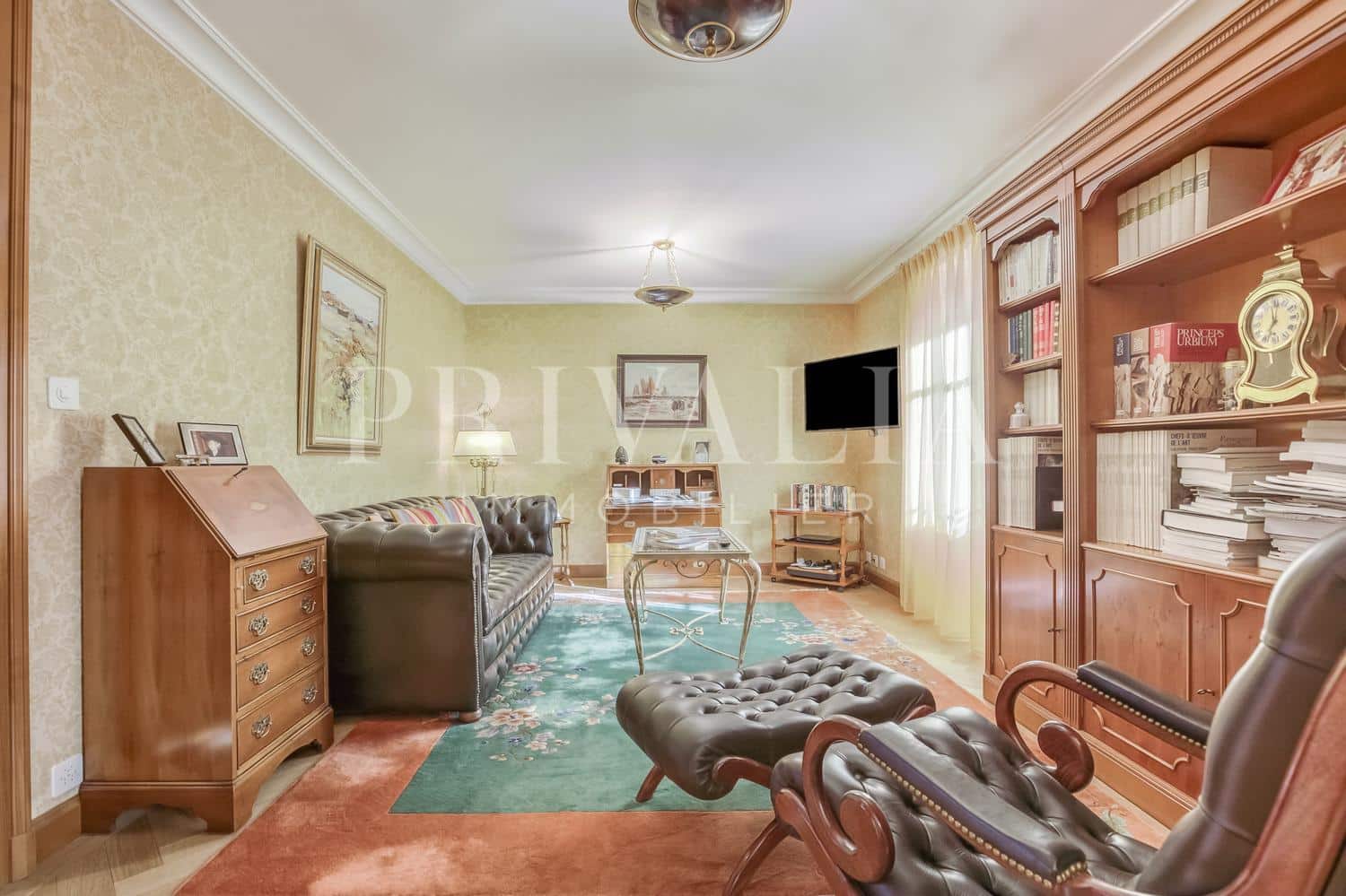 - Salon avec son majestueux poêle en céramique et sa bibliothèque