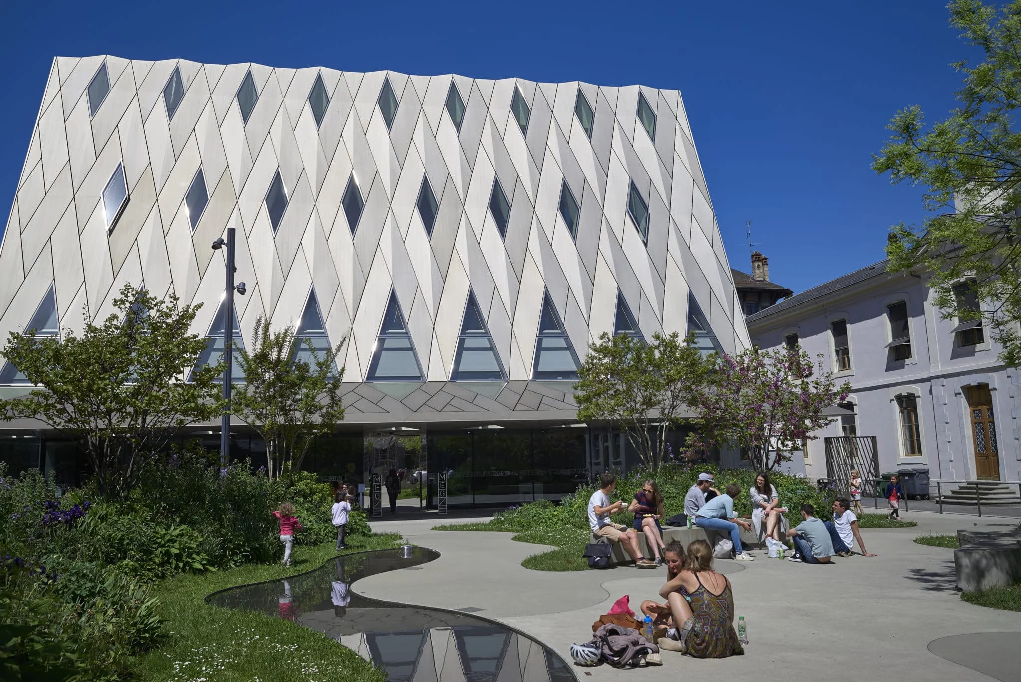 Cinquante bureaux, principalement venus de Suisse et de pays limitrophes, participent au concours, mais c’est le concept des architectes zurichois Graber Pulver Architekten AG qui séduit le jury par sa logique en « iceberg ». En effet, deux tiers du bâtiment sont logés en sous-sol, ce qui permet d’éviter une modification excessive de l’aspect global du site. Cette idée solutionne également le trop-plein de luminosité, offrant ainsi d’infinies variations décoratives. Autre point positif : l’espace gagné (grâce à la partie souterraine) libère une agréable place publique. De loin, on reconnait facilement le MEG à son toit à double pente, revêtu d’aluminium anodisé. Le musée fait alors office de point de repère dans la rue, ajoutant ainsi un éclat de « beauté contemporaine » au quartier des bains.