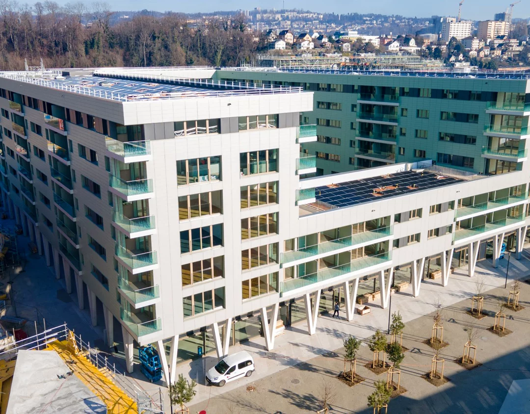 Composé de huit bâtiments, il hébergera appartements, commerces et services de proximité ainsi que des surfaces de bureaux. Ce futur lieu de vie favorisera les échanges humains, les rencontres et la mobilité douce, comme en témoignent sa future salle de fitness de 1’000 m² et ses aménagements extérieurs de qualité : jeux d’eau, restaurant, parc arborisé de plus de 6’000 m², salle polyvalente de 400 personnes.