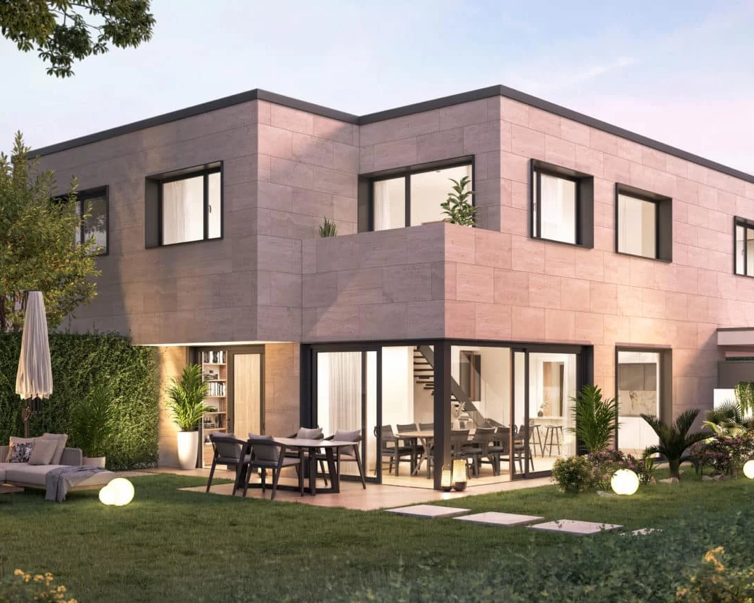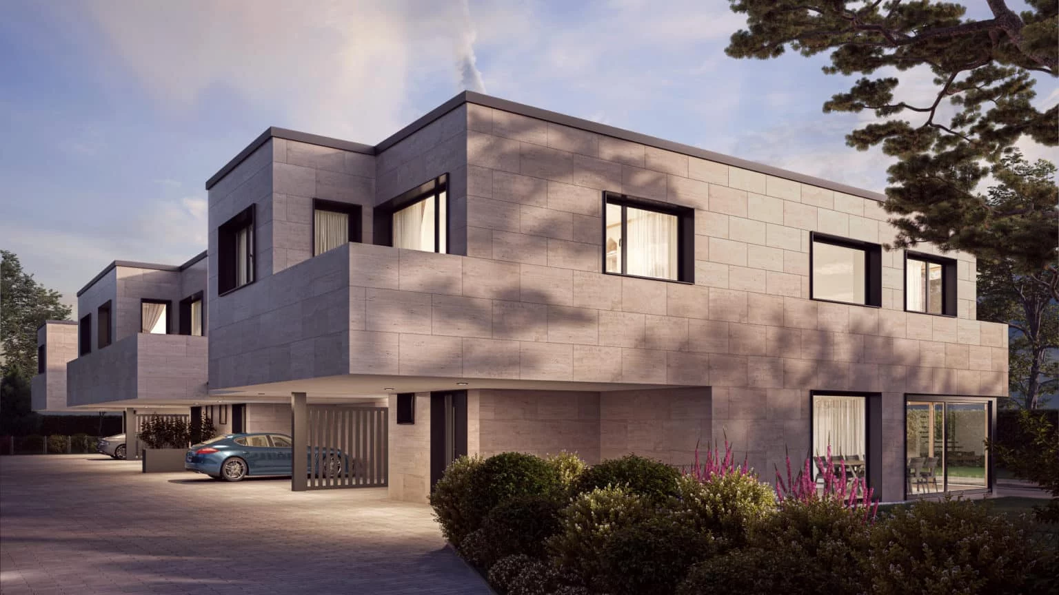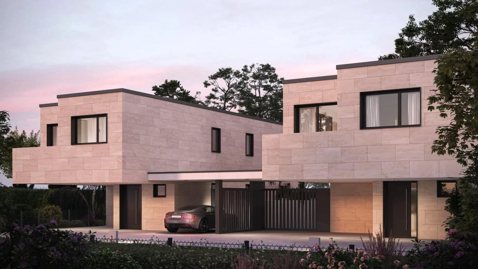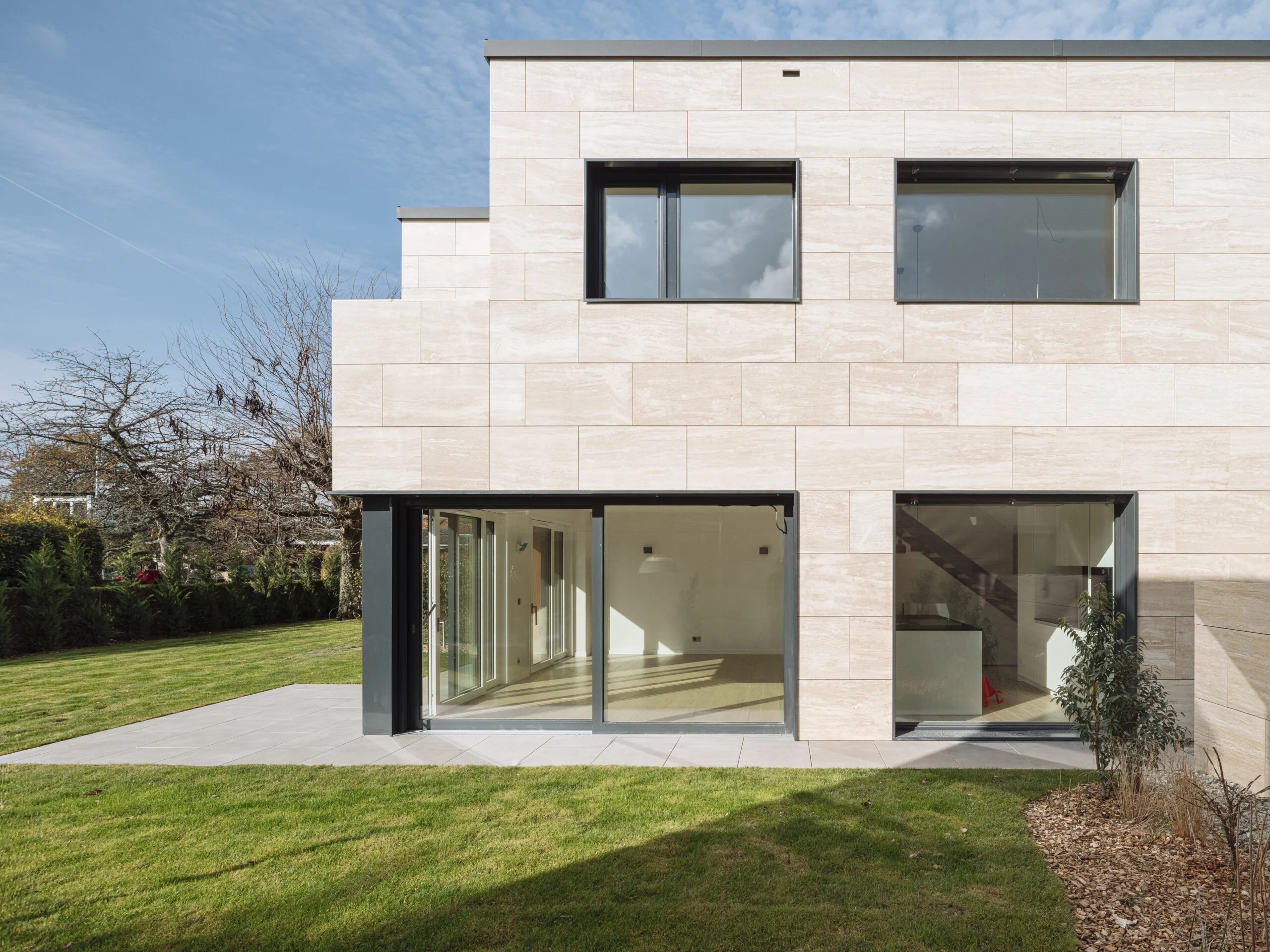 – Architecture contemporaine et épurée avec des façades en pierre naturelle de travertin